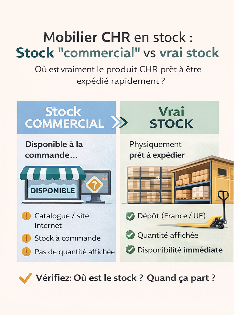 À lire aussi (guide complet Pilier 2) : Mobilier CHR en stock : acheter vite sans se tromper (Guide Pro + Checklist).