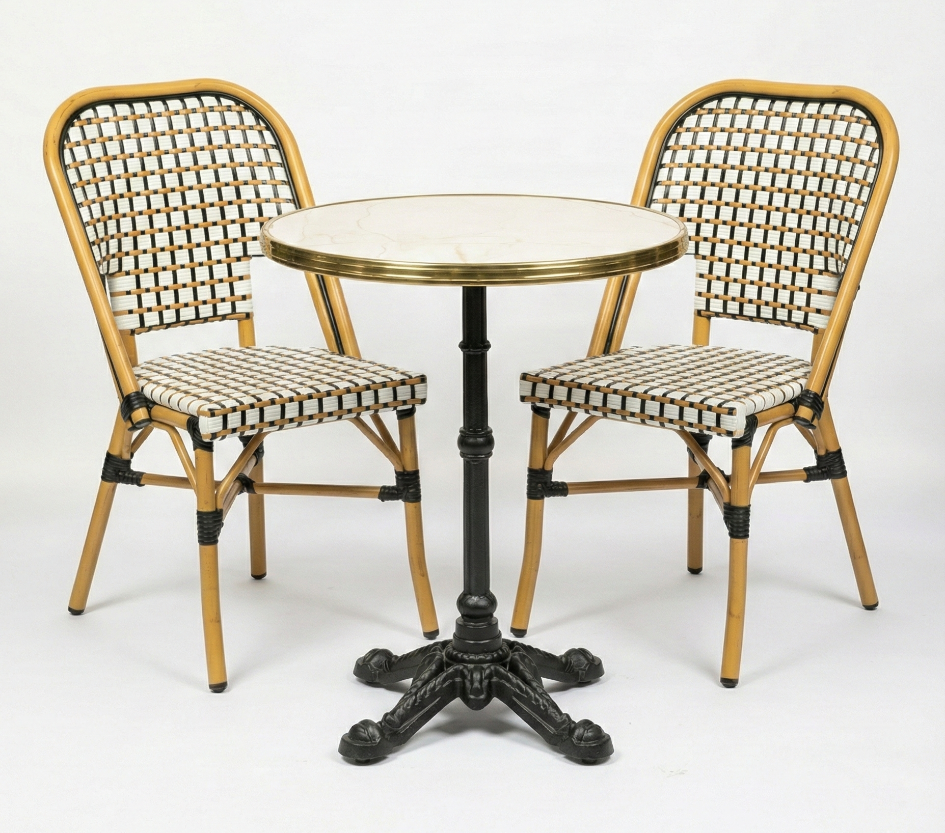 Cet ensemble bistrot rotin 70 cm comprend une table ronde décor marbre beige doré avec pied fonte PARIS 4 ainsi que deux chaises rotin CONGO empilables. Vous obtenez ainsi une solution complète, cohérente et immédiatement exploitable.