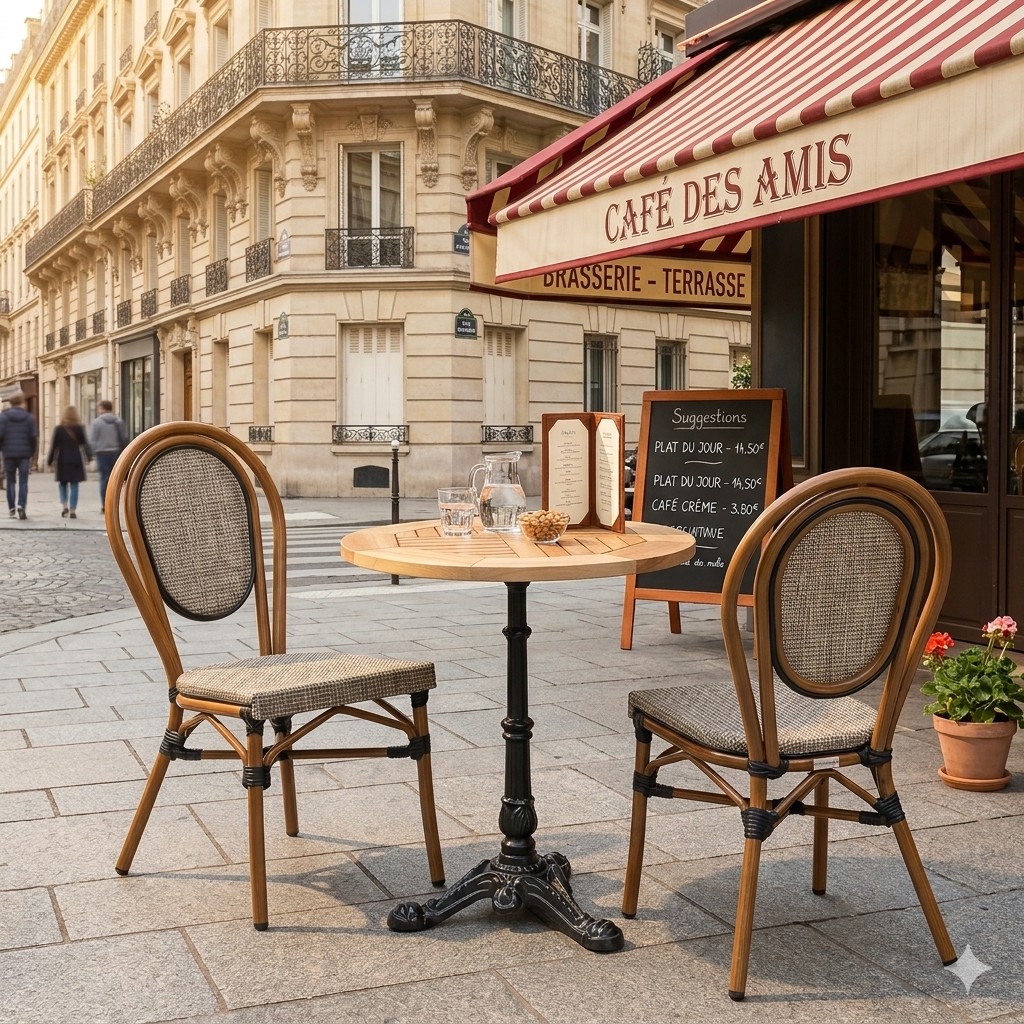 Dans un restaurant ou un café, le mobilier doit résister à une utilisation quotidienne. C’est pourquoi cet ensemble bistrot terrasse professionnel est conçu avec des matériaux robustes et durables.