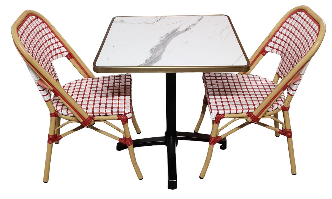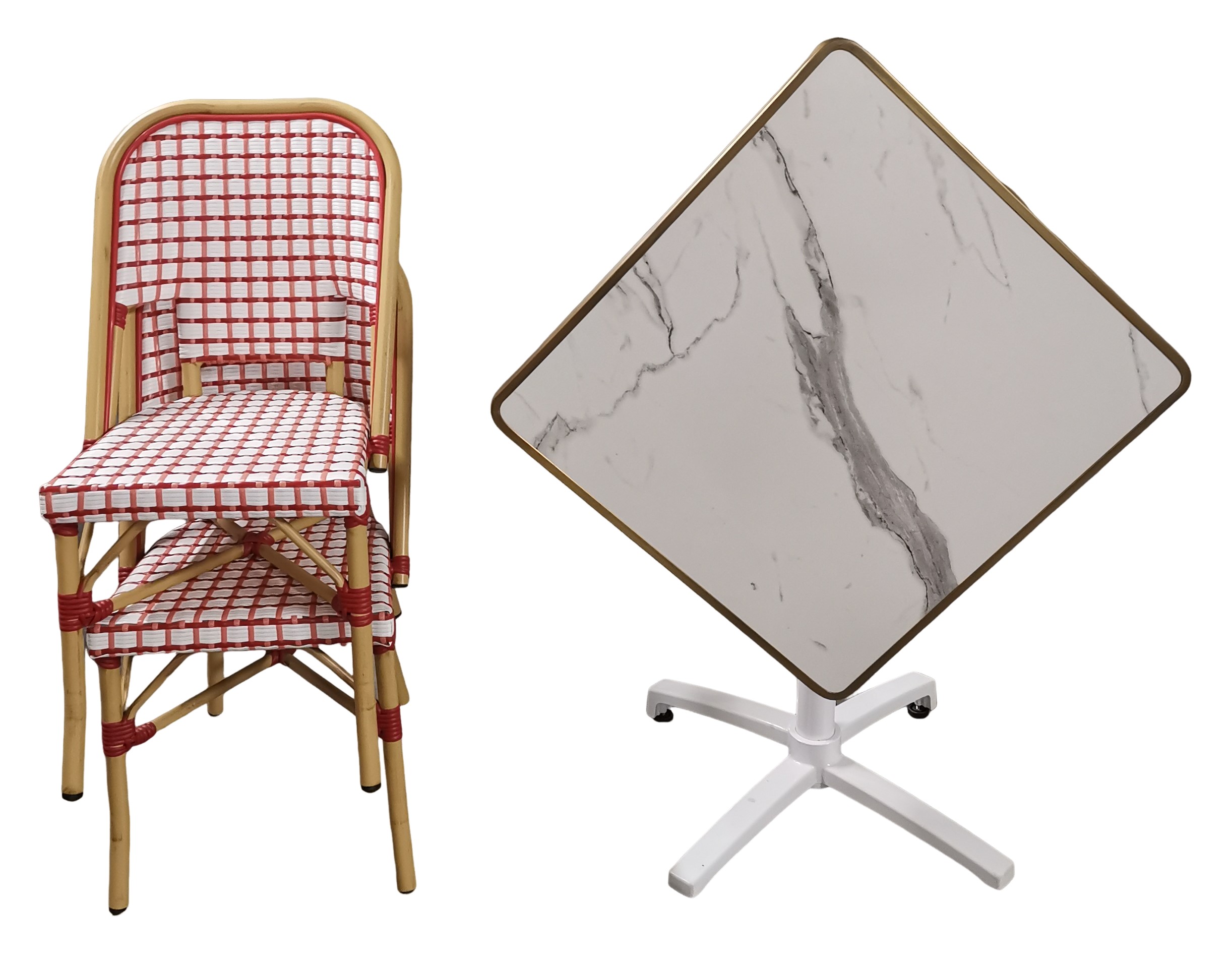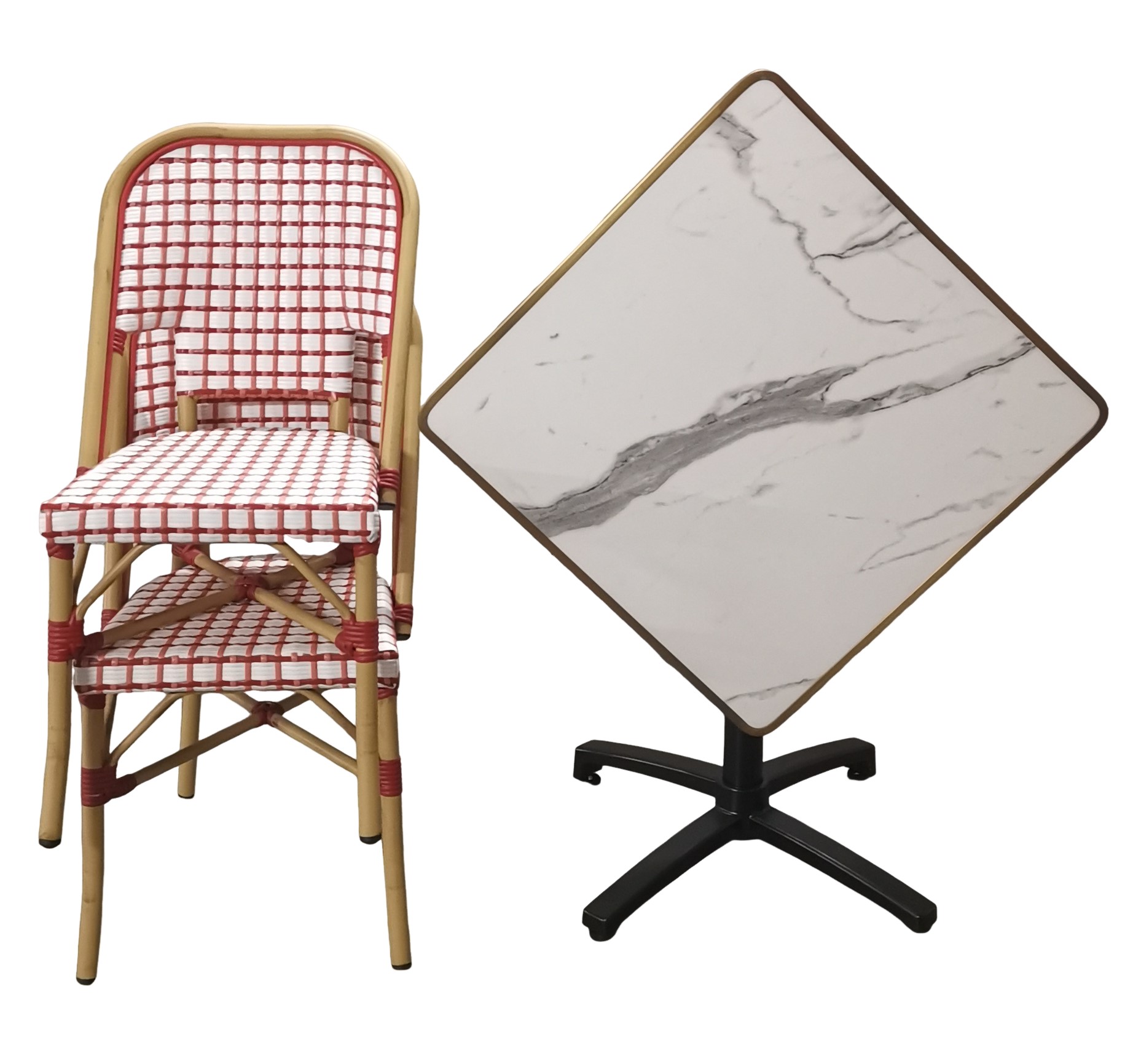 Cet ensemble terrasse restaurant Calacatta + Pinky est une solution clé en main pour aménager rapidement une terrasse professionnelle élégante et durable. Il associe une table bistrot compacte décor marbre blanc et deux chaises empilables au style parisien. Ainsi, vous équipez facilement un café, un hôtel ou une brasserie tout en valorisant votre espace extérieur.