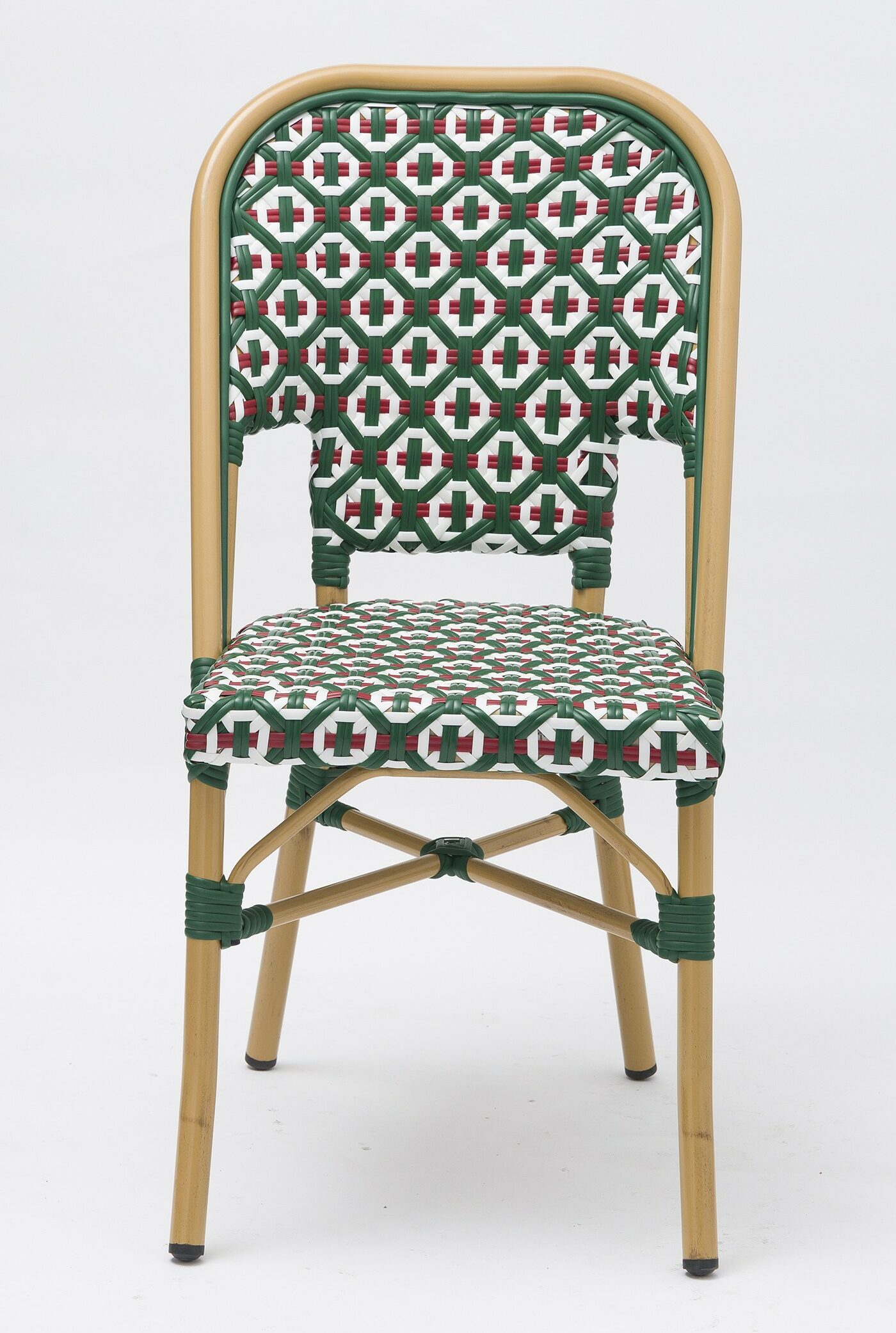 L’assise et le dossier sont réalisés en rotin PE plat (8×1,3 mm et 12×1,3 mm). De ce fait, le mobilier résiste efficacement aux UV, à l’humidité et aux variations climatiques. En outre, les couleurs vert, blanc et rouge conservent leur éclat dans le temps. Par ailleurs, l’entretien reste simple et rapide.
