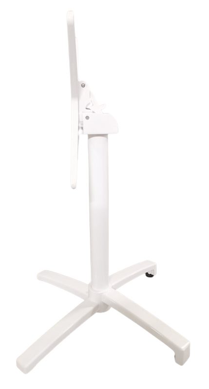 La tête pivotante permet de basculer facilement le plateau ; ainsi, le rangement devient rapide en fin de service. Par ailleurs, ce système est particulièrement apprécié pour les terrasses nécessitant un gain de place.