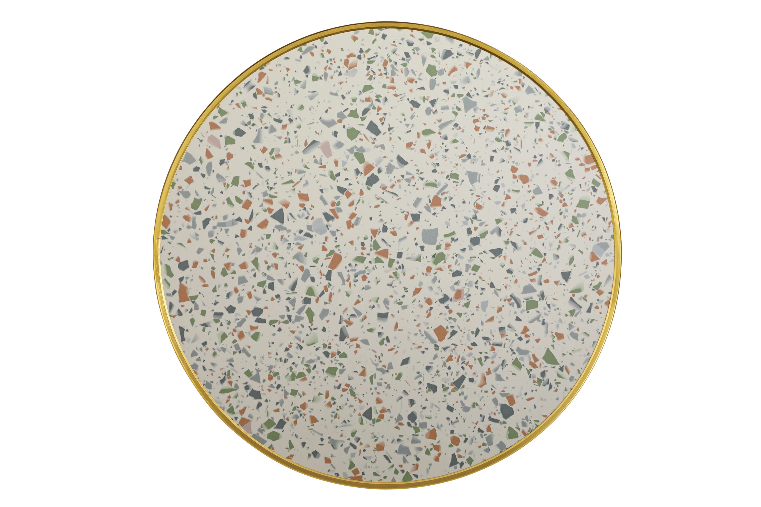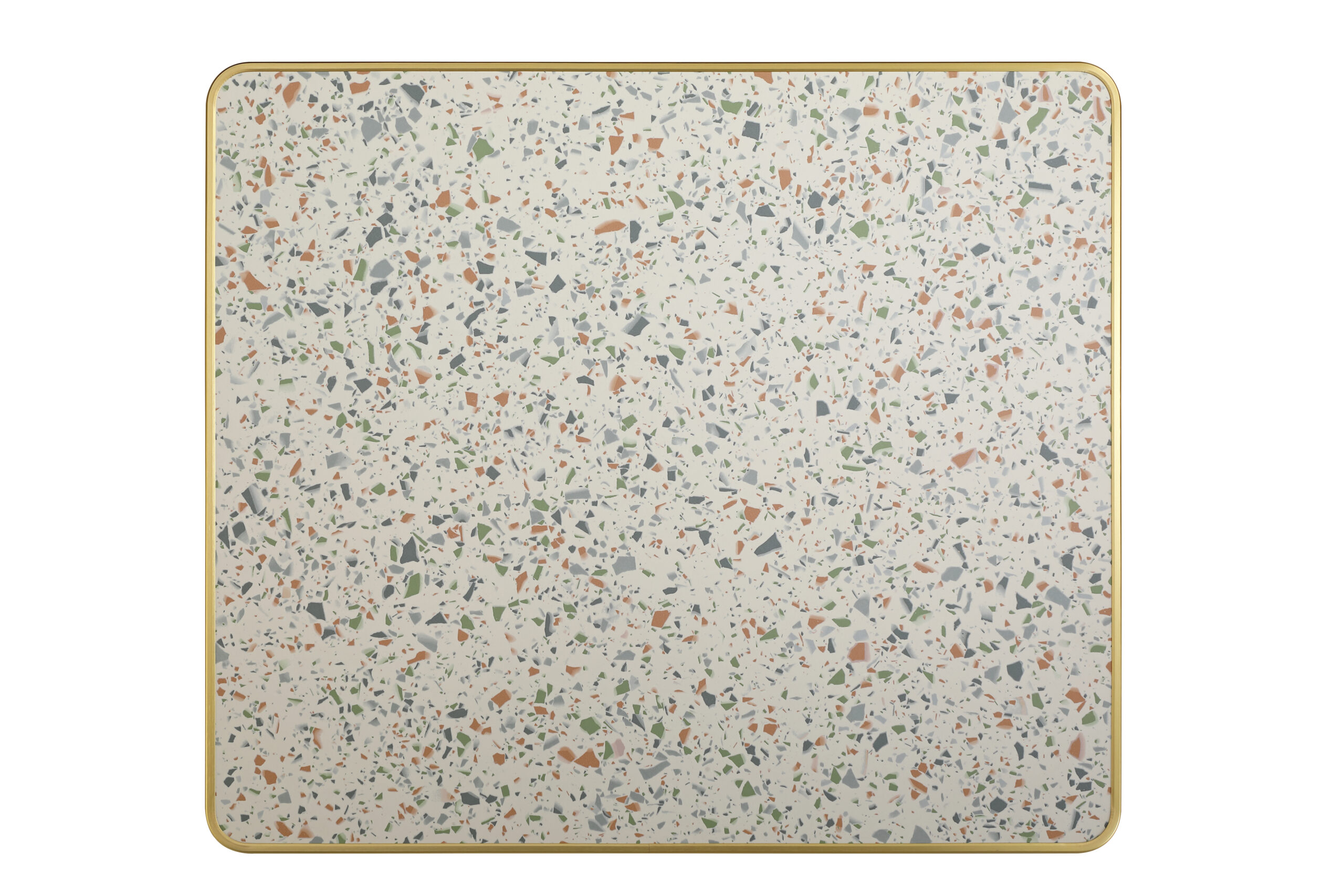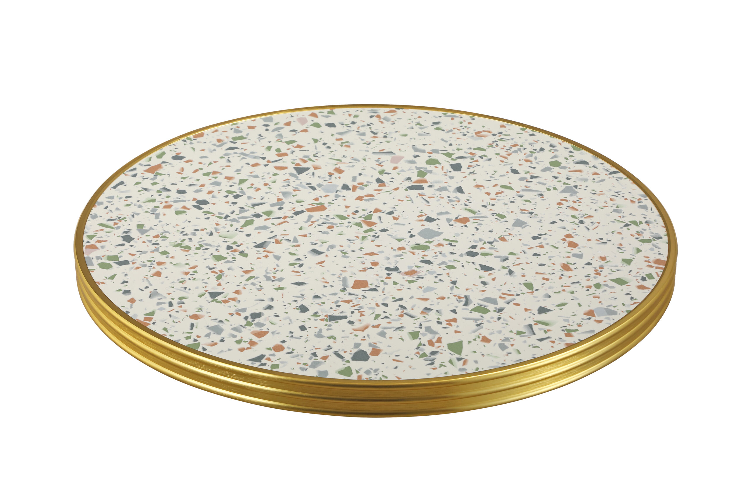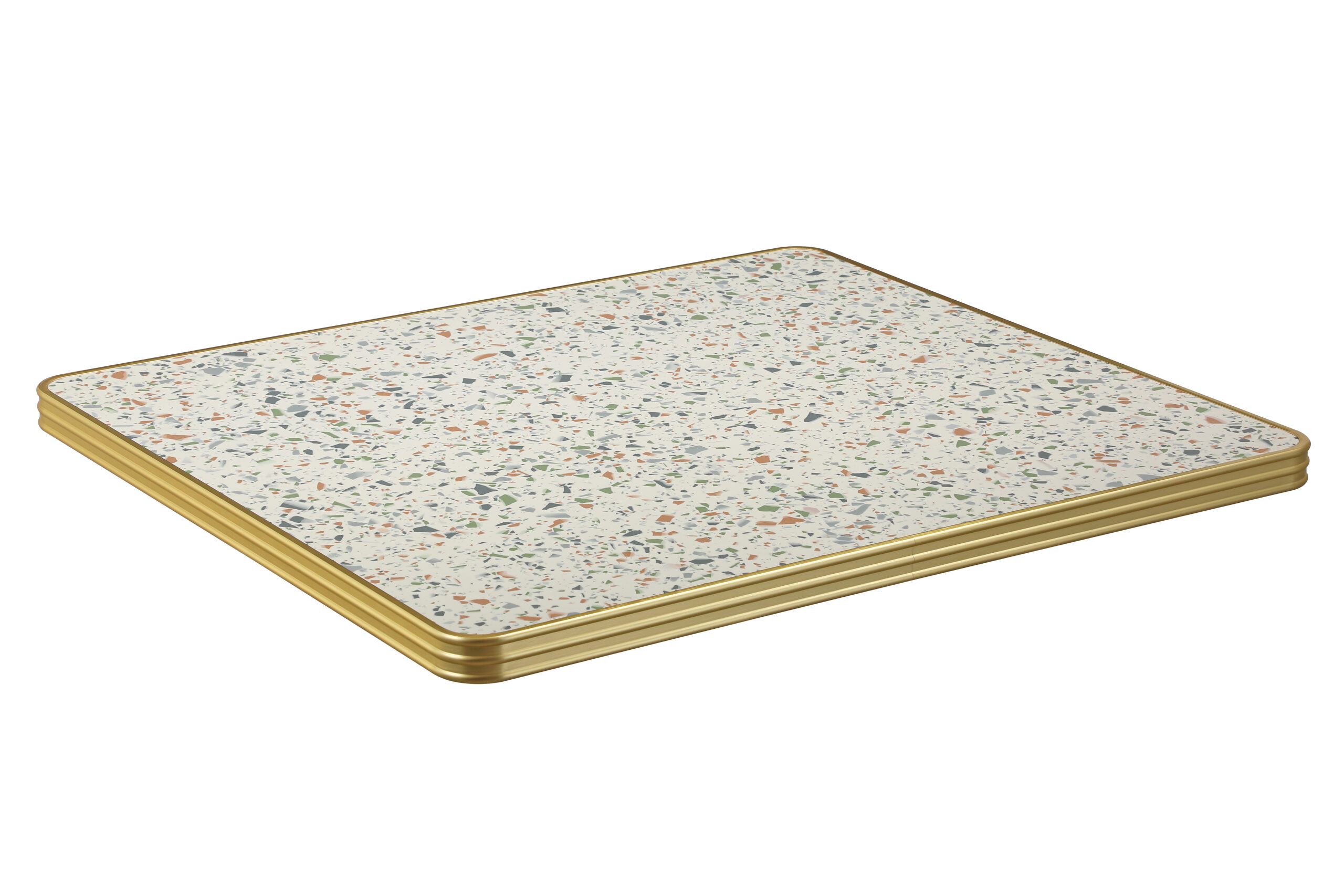 Ce plateau est réalisé en stratifié décor terrazzo blanc, associé à un cerclage aluminium finition laiton. En effet, cette combinaison apporte une finition soignée tout en protégeant les chants contre les chocs du quotidien.
