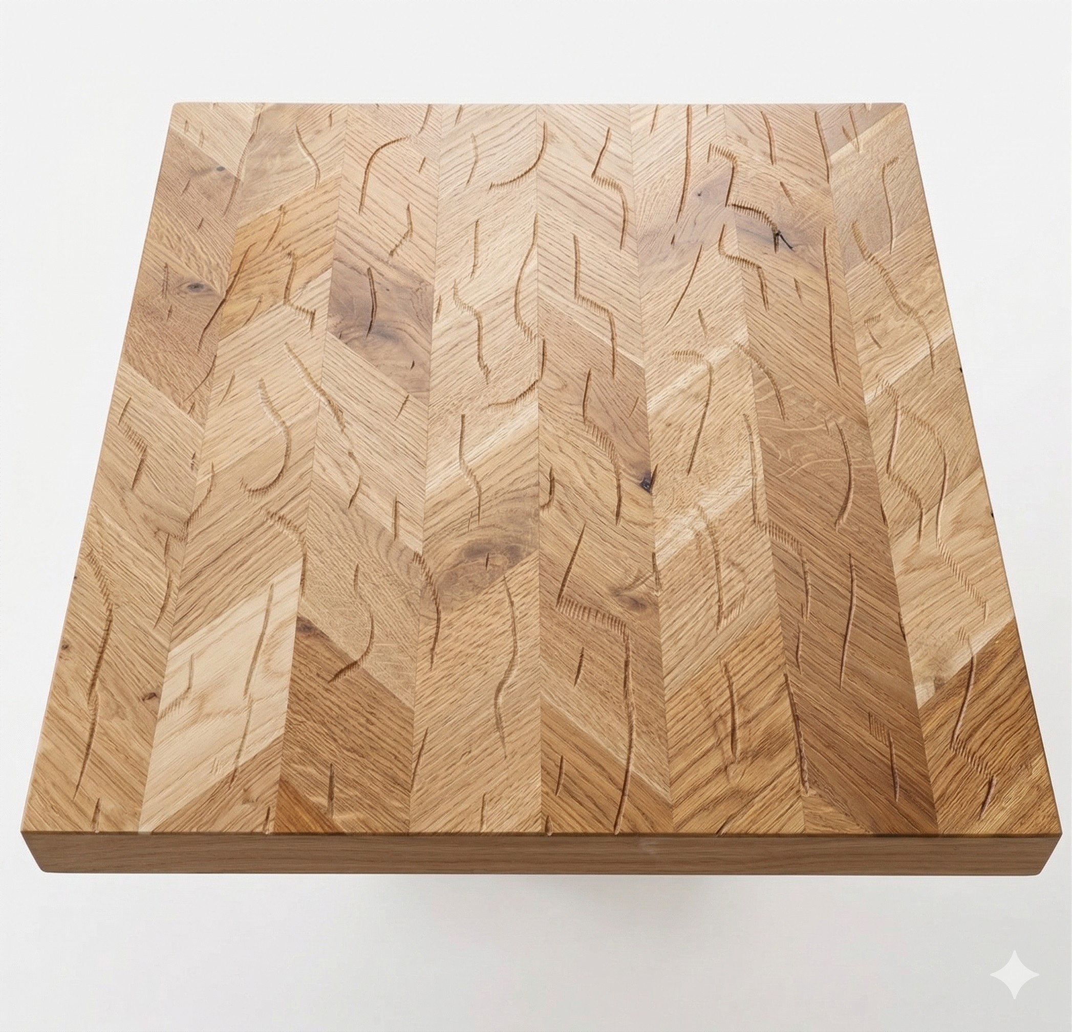 Le décor chevron vieilli est obtenu grâce à un travail manuel artisanal au couteau. Par conséquent, chaque plateau présente un rendu vivant et élégant. De ce fait, ce détail fait la différence dans un projet d’aménagement soigné.