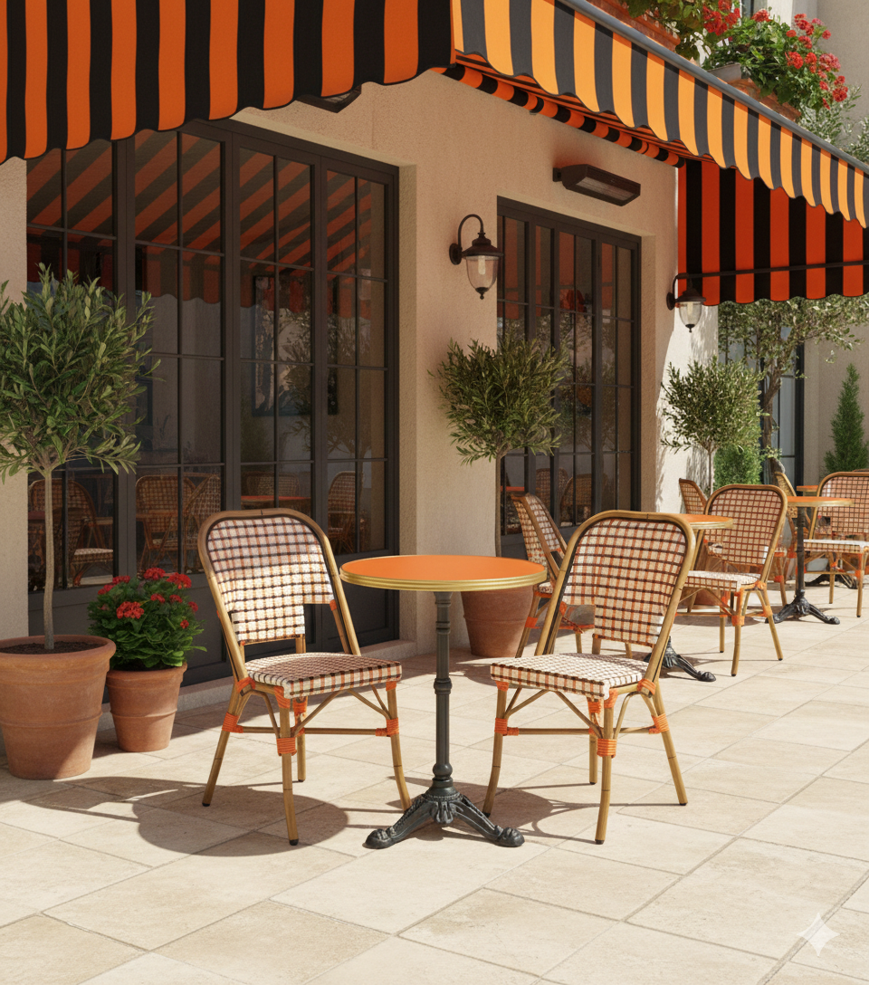 Cette table se combine naturellement avec la chaise bistrot rotin orange et noir Amsterdam. De plus, l’association du plateau orange cerclé laiton avec le rotin crée une ambiance bistrot chaleureuse et très visible, idéale pour les terrasses et les salles à forte fréquentation.