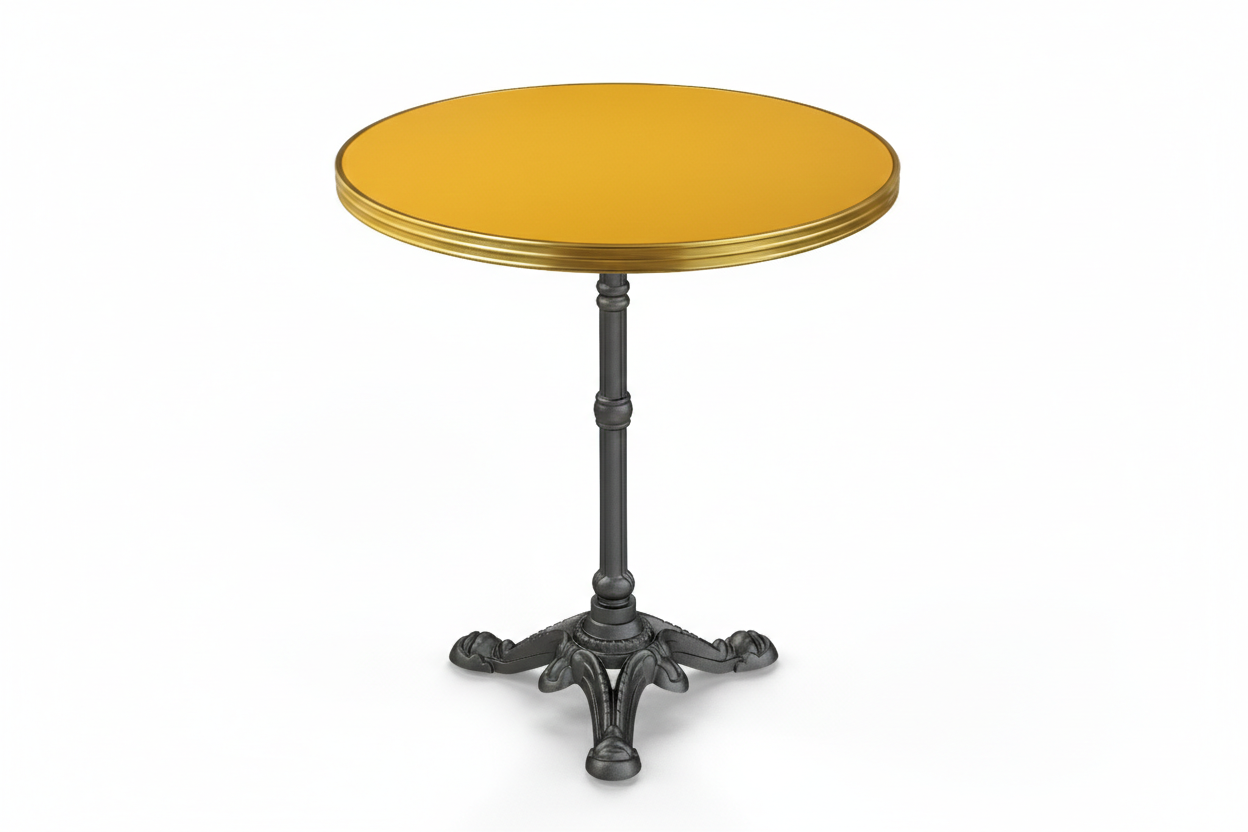 La table bistrot Barcelona est conçue pour répondre aux contraintes des cafés, restaurants et brasseries. Elle associe un plateau stratifié jaune Ø60 cm à un piètement Paris 3 en fonte d’acier. Ainsi, elle garantit une excellente stabilité, tout en restant simple à entretenir au quotidien. Grâce à son format compact, ce modèle s’intègre facilement dans les salles comme en terrasse. De plus, il permet d’optimiser l’espace sans compromettre le confort des clients. Par conséquent, il constitue une solution particulièrement adaptée à la restauration professionnelle.